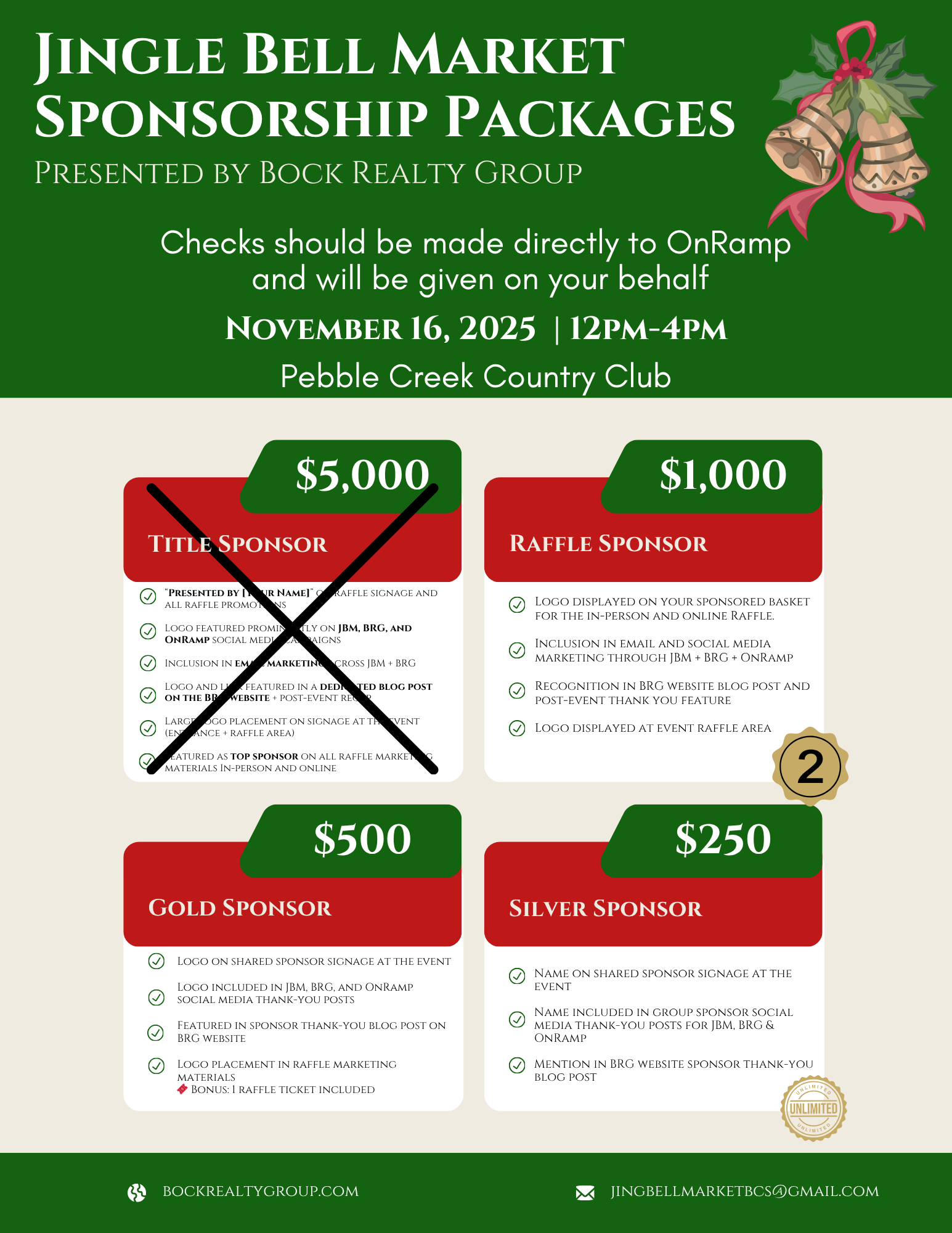 This year’s Jingle Bell Market will be held on Sunday, November 16, 2025 from 12 PM to 4 PM at Pebble Creek Country Club.